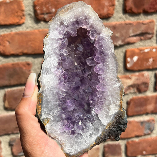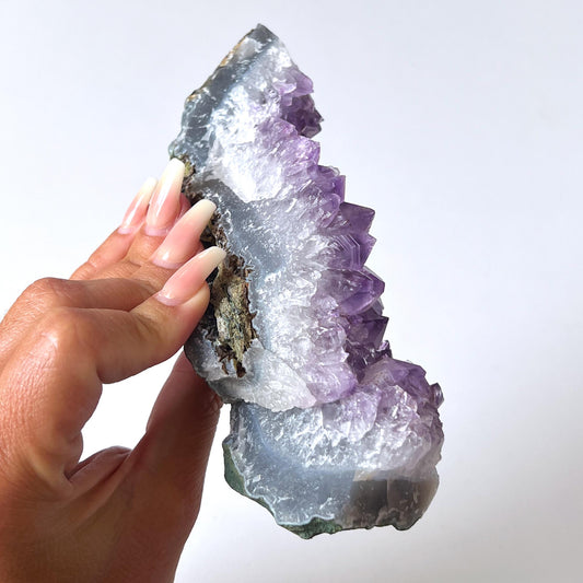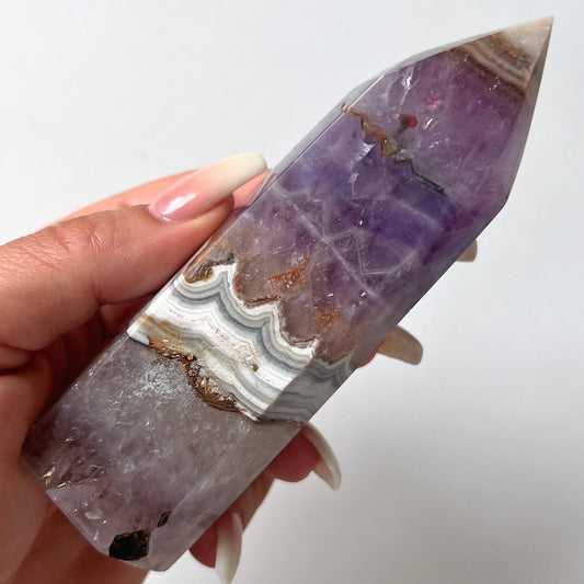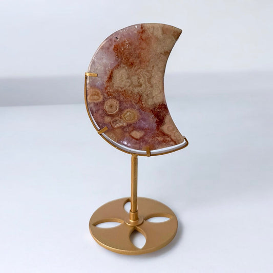 Amethyst Flower Agate Crescent Moon on Gold Stand