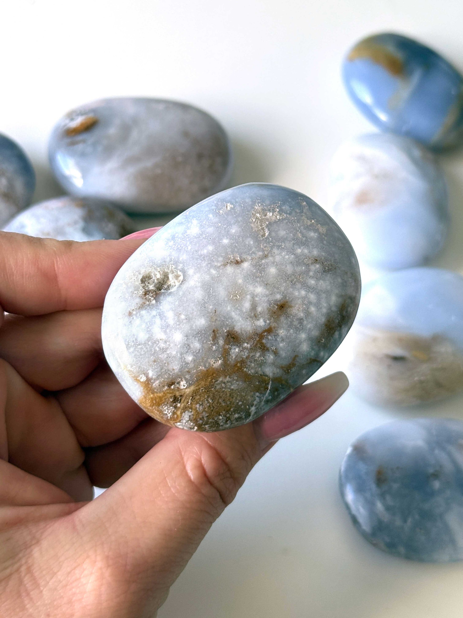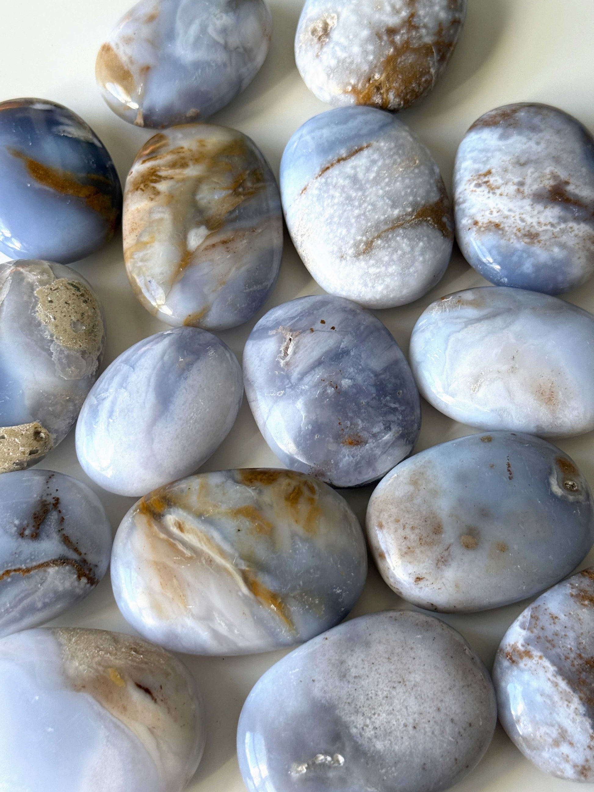 Blue Chalcedony carries a soft, soothing energy that brings peace to the mind and harmony to the heart. Known as a gentle communicator’s stone, it helps ease anxiety, encourages honest expression, and supports emotional clarity. Its calming vibration makes it a beautiful ally for grounding your thoughts, speaking with grace, and inviting serenity into your space.