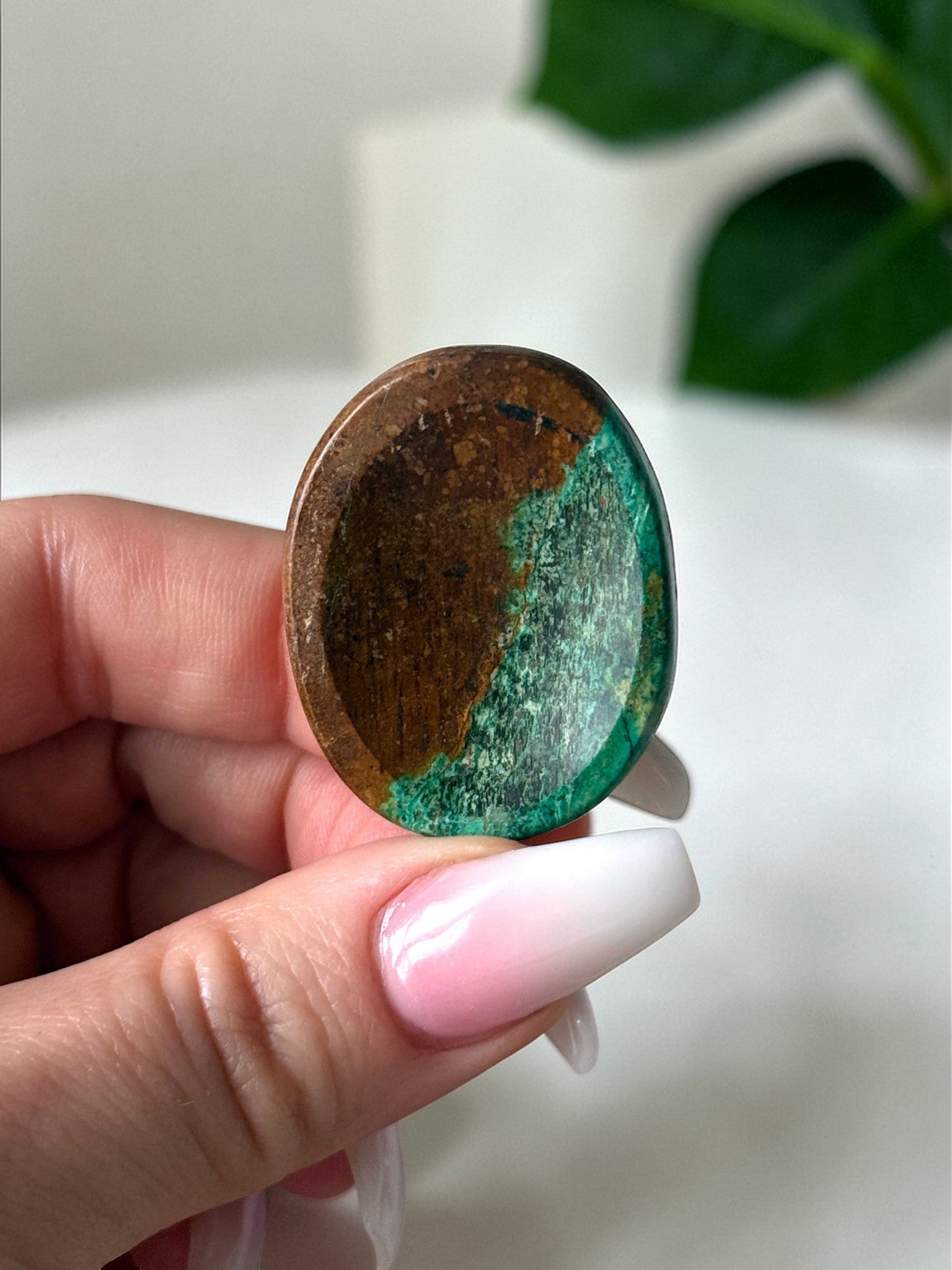This unique Chrysocolla worry stone has a beautiful green and brown pattern. You will receive the exact stone pictured.