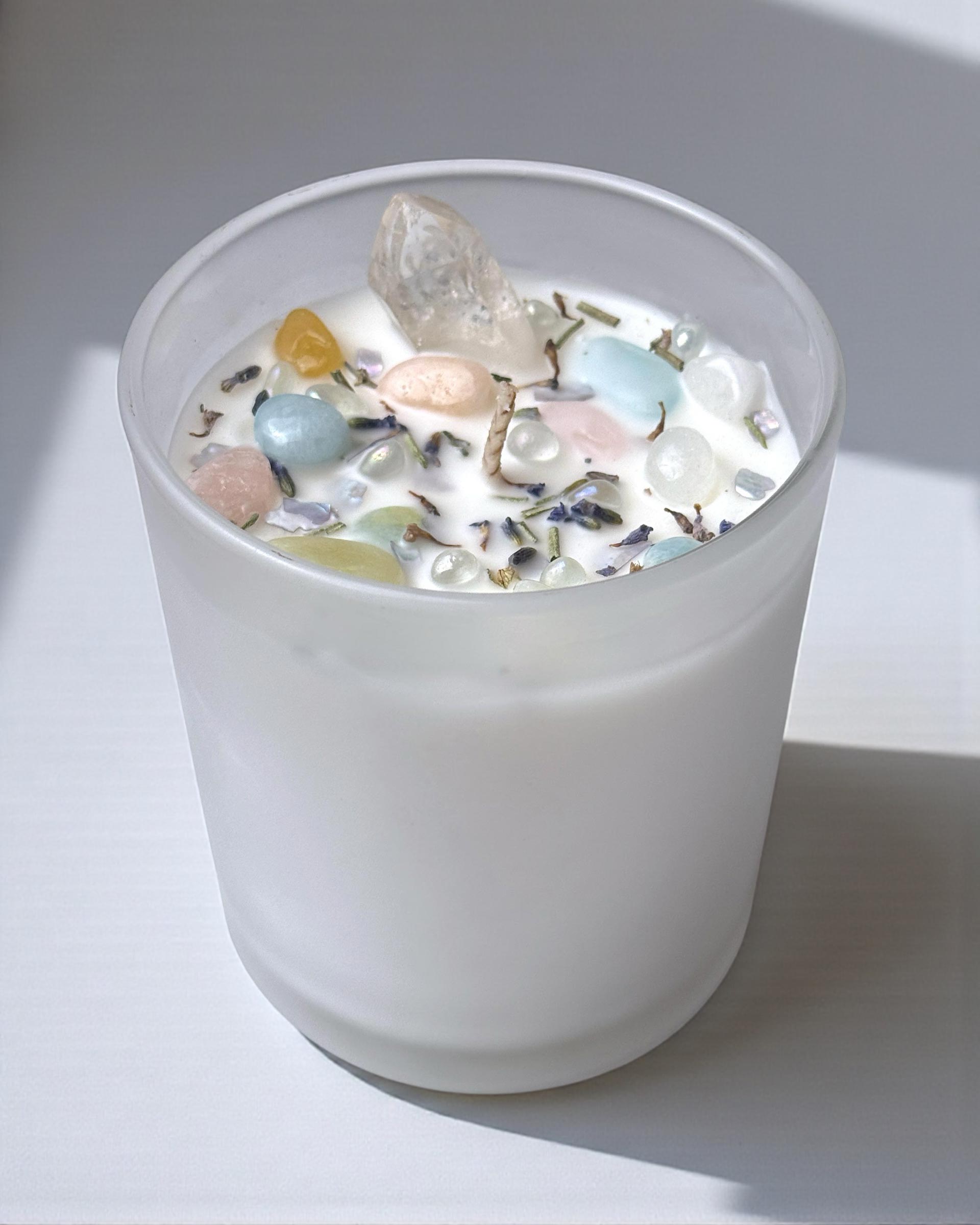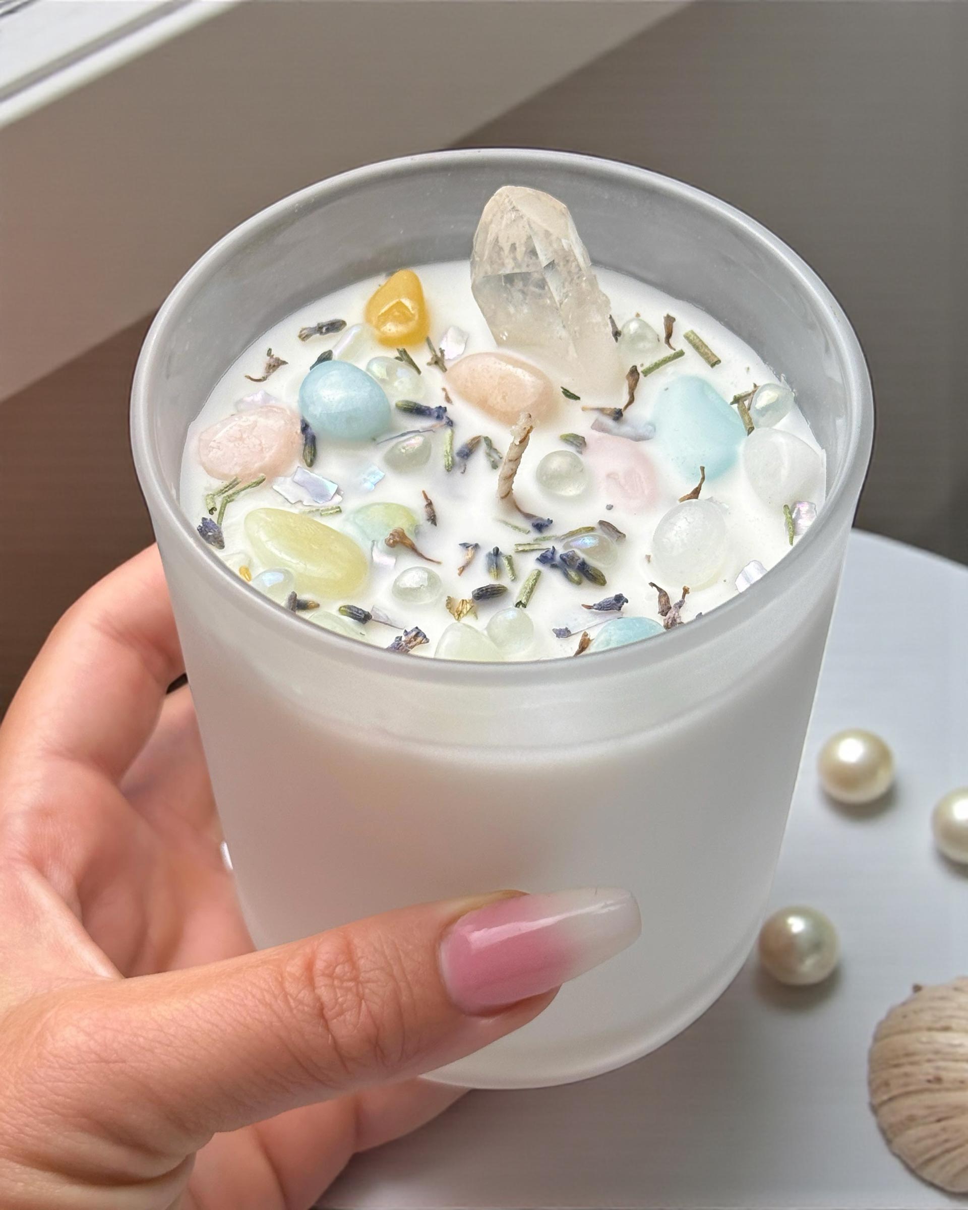 The Tides of Renewal Candle is a handcrafted soy crystal candle created to restore balance, clear stagnant energy, and awaken the spirit to transformation. Infused with the high-vibrational crystals Clear Quartz, Blue/Green Aquamarine, Morganite, and Aura Quartz, blended with the purifying herbs Rosemary and Lavender, and sprinkled with Abalone Shell flakes, this candle channels the cleansing, restorative power of the ocean — its ebb and flow mirroring the release and renewal within your own energetic depths.