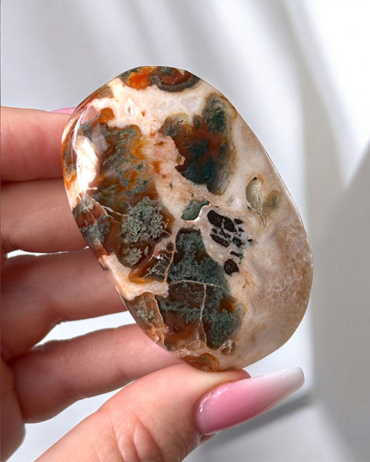 Sold outMoss Agate Carnelian Palm Stone